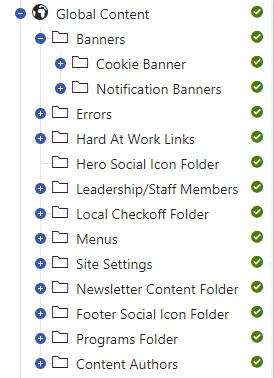 Global content is content that is shared across portions of a website. Common examples are website headers, footers, and other items that can be used on multiple pages.
