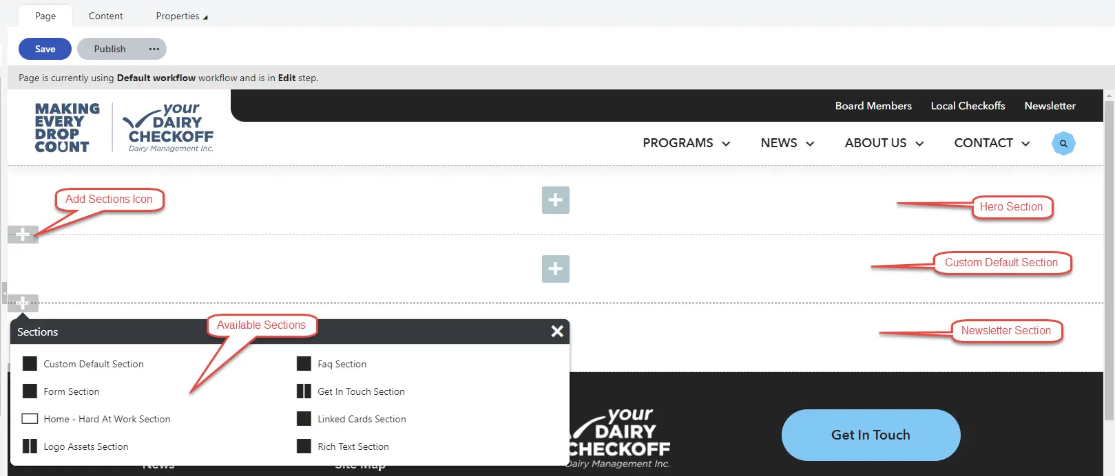 - When creating a page using Page Builder, you first see three editable sections of the page by default from top to the bottom - Hero Section, Custom Default Section and Newsletter Section.