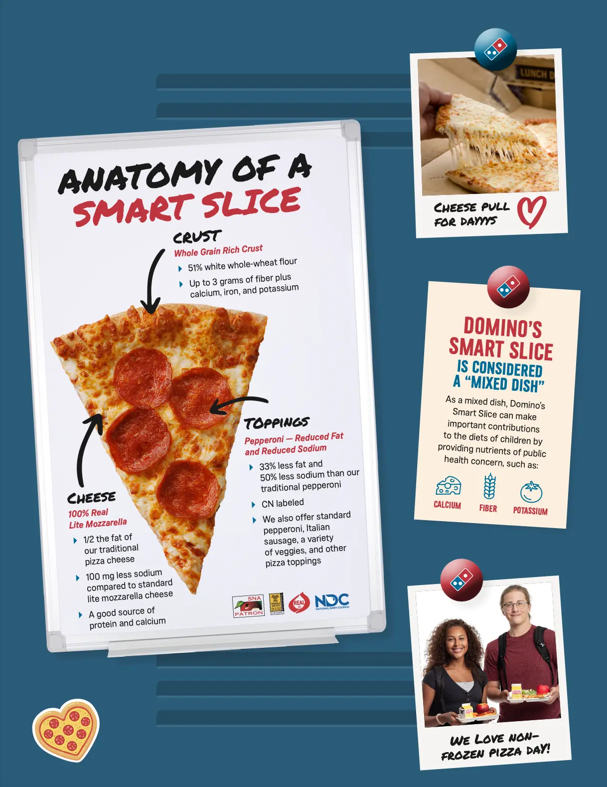 Innovation also is alive and well through our partnerships with leading restaurant chains. One standout example is Smart Slice pizza developed with our longtime partner Domino’s. Pizza always has been a cafeteria favorite, but its nutritional value didn’t always meet USDA guidelines. Enter Smart Slice – a reformulated option using real lite mozzarella cheese and other improved ingredients that meets federal school nutrition standards.